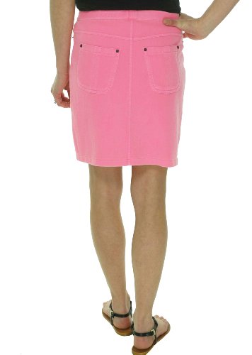 Hue women's Chino Skirt in bright neon features real back pockets. Faux front pockets and fly. Rivet detail. Above the knee length. Comfortable elastic waist band. Stretch material.