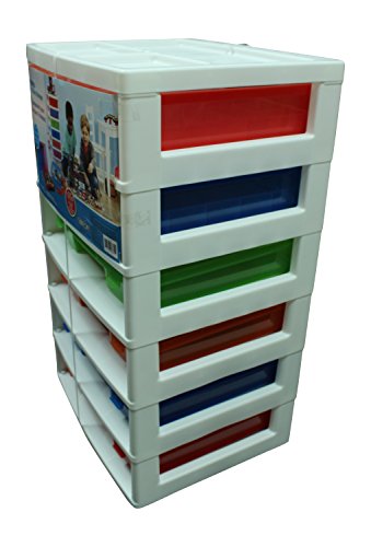 Stay organized with the Bricks Six-Level Storage Unit. Easily keep building blocks and other toys stored away conveniently and accessibly. The two top drawers, each with a divider tray, provide organized storage solutions for even the smallest of pieces. The four cases in multiple colors are easily removed and carried around the room so that it's easy to set up and clean up every time.Feature
