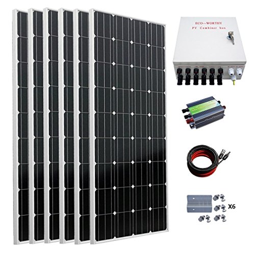-. Brand : ECO-WORTHY -. EAN : 0788568241980 -. Feature : The 960 Watts 24Volts polycrystalline solar panel has several uses including marine, dry camp, and other off-grid applications. / High-efficiency silicon solar cells ensure high performance of solar modules and create maximum power output. 25-year transferable power output warranty: 5-year/95% efficiency rate, 10-year/90% efficiency rate, 25-year/80% efficiency rate. / Easy to install with solar panel mounting brackets and 1 pair 16 feet black & red extension solar cable for connecting PV array to the charge controller conveniently. Each solar panel comes with 1 pair of 35 inches cables with MC4 Male/Female connectors for quickly setting up. / By-pass diodes are pre-installed in waterproof IP-65 rated juncton box to minimize power drop caused by shade and ensure excellent performance in low-light environments. Corrosion-resistant aluminum frame and anti-reflection coated glass withstand high winds (2400Pa) and snow loads (5400Pa). / The system has the capability of withstanding heavy snow and strong wind loads. -. Label : ECO-WORTHY -. Manufacturer : ECO-WORTHY -. ProductGroup : Lawn & Patio -. ProductTypeName : OUTDOOR_LIVING -. Publisher : ECO-WORTHY -. Size : 1000w mono kit with PV combiner box -. Studio : ECO-WORTHY -. Title : ECO-WORTHY 1000 Watts Off Grid Solar Panel Kit: 6pcs 160W Mono Solar Panels+45A Solar Charge Controller+MC4 Solar Cable+PV Combiner Box+Solar Panel Mounting Brackets -. UPC : 788568241980