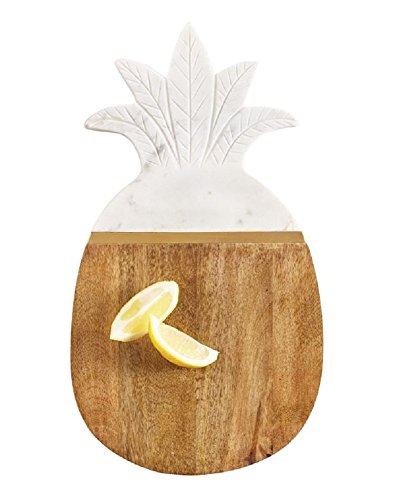 Wooden pineapple shaped serving board features textured white marble crown and brass finished metal accent band. Size: 16" x 9"