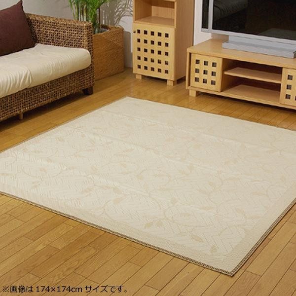 麻の一種であるジュート糸と、ポリエチレン糸のジャガード織のカーペットです。裏面にはフローリングを傷つけにくいよう不織布を貼っています。 |