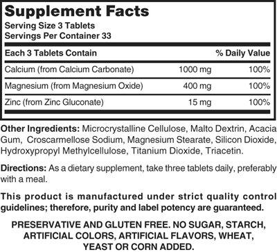 Nature's Blend Calcium, Magnesium and Zinc delivers 1,000 mg of calcium carbonate per 3 tablet serving. Preservative and gluten free. No sugar, starch, artificial colors, artificial flavors, wheat, yeast or corn added.Feature