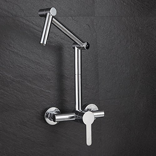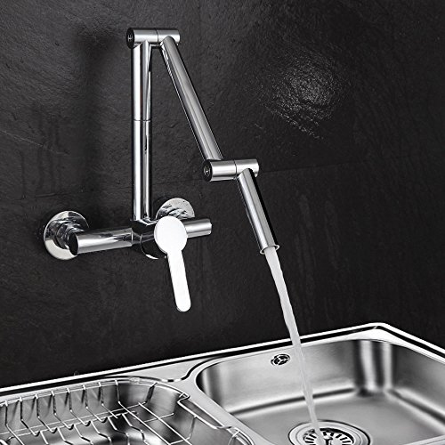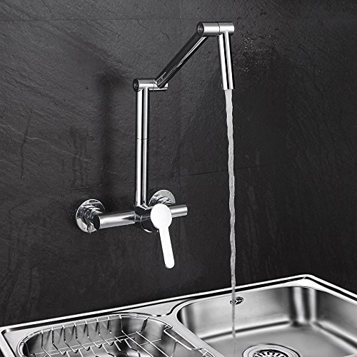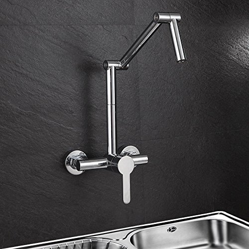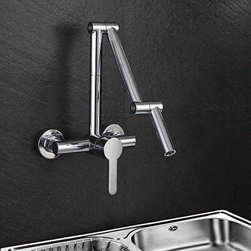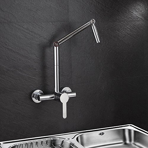 Featuring swiveling and articulating design, this innovative wall mount kitchen faucet allows for a total range of motion that extends or lowers the faucet with ease to put the water right where it is needed