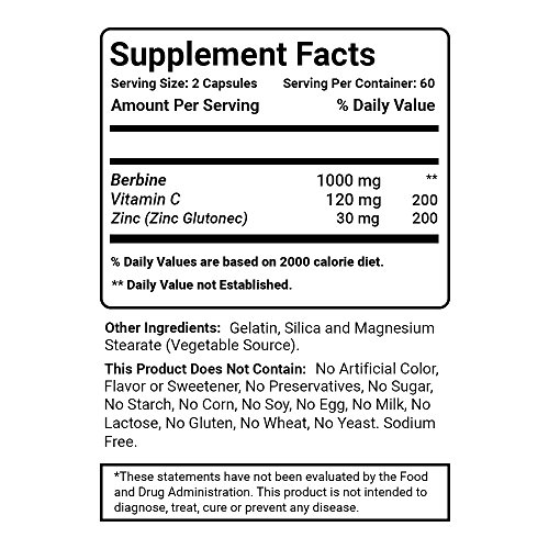 Our Berberine 1000mg contains Berberine 1000 mg, Zinc 30 mg & Vitamin C 120 mg per serving - 120 capsules per bottle