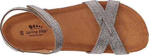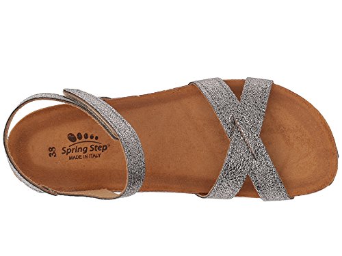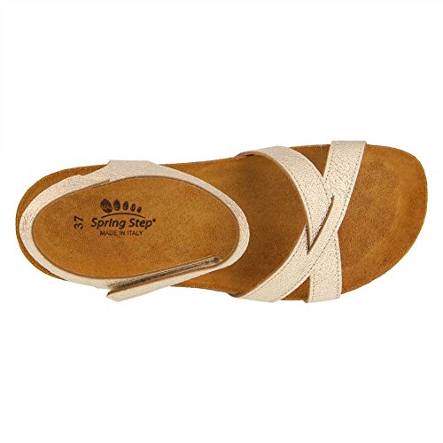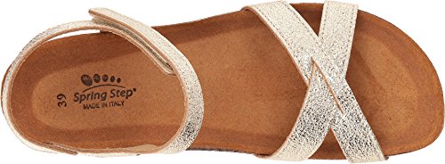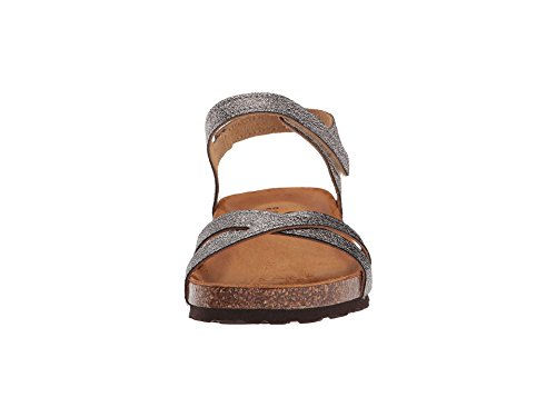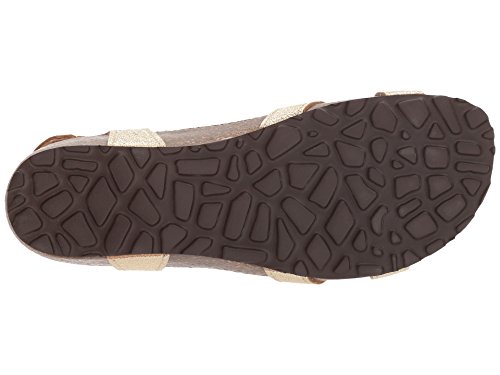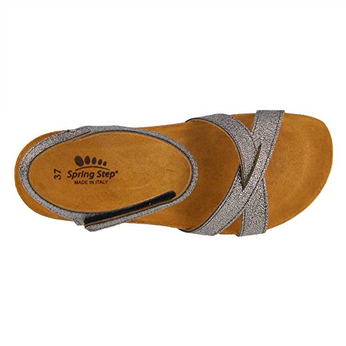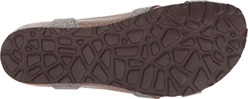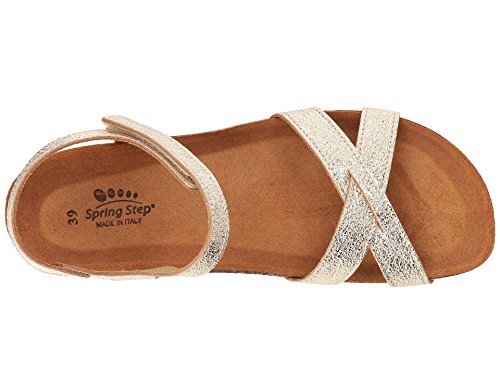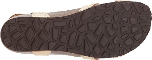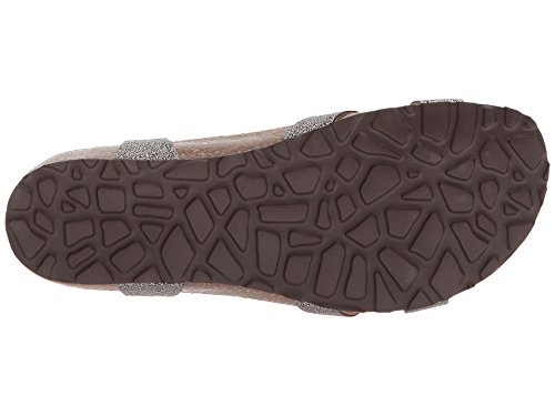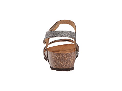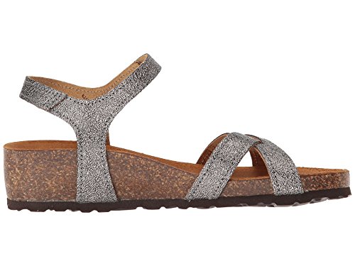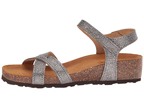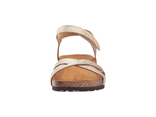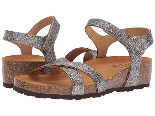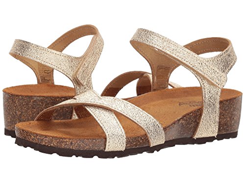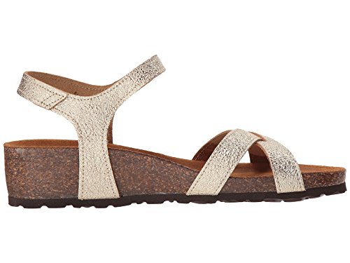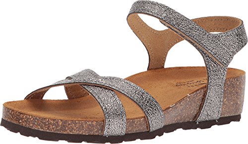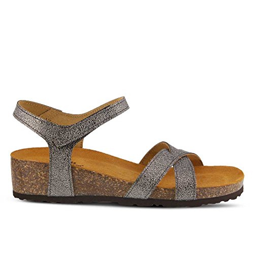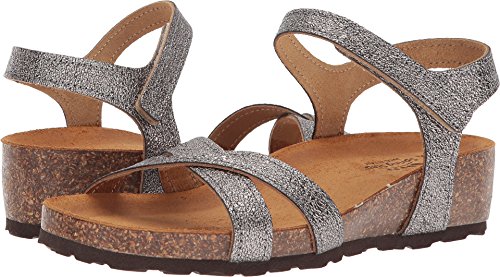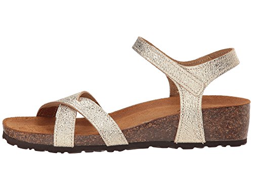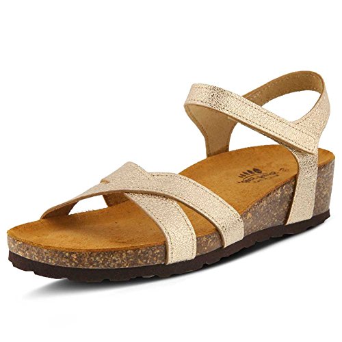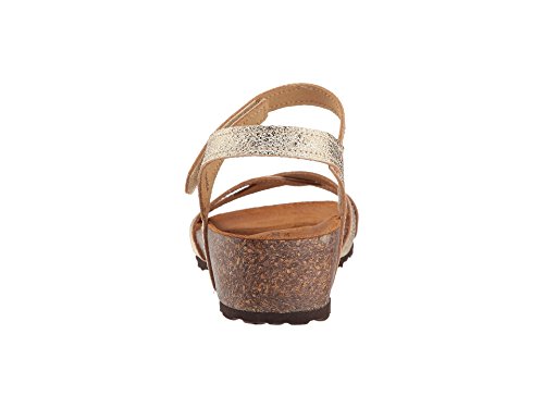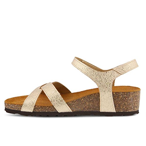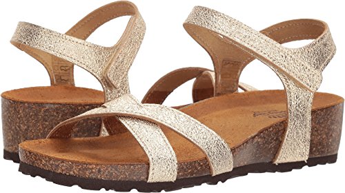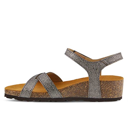 Product DescriptionElegant metallic quarter strap sandal featuring an adjustable ankle strap on a cork-and-latex wedge.0