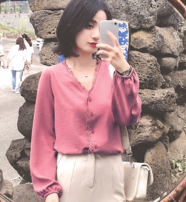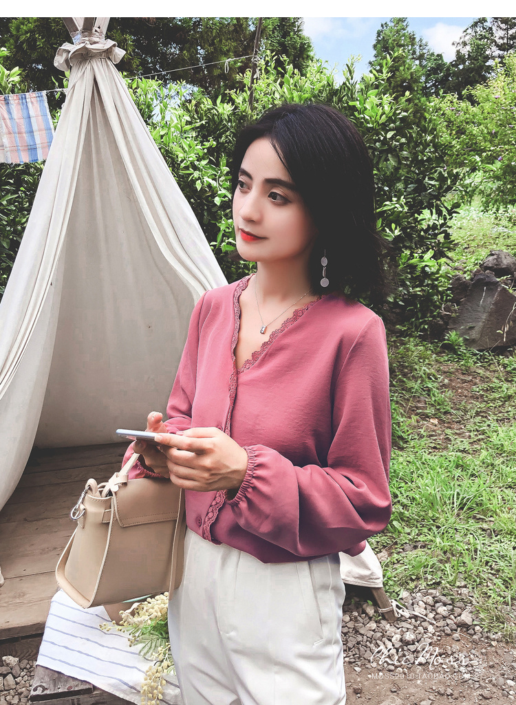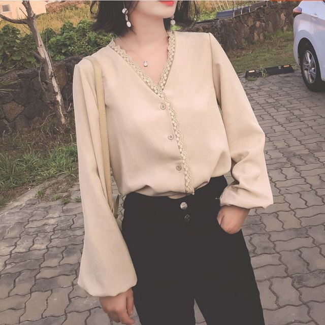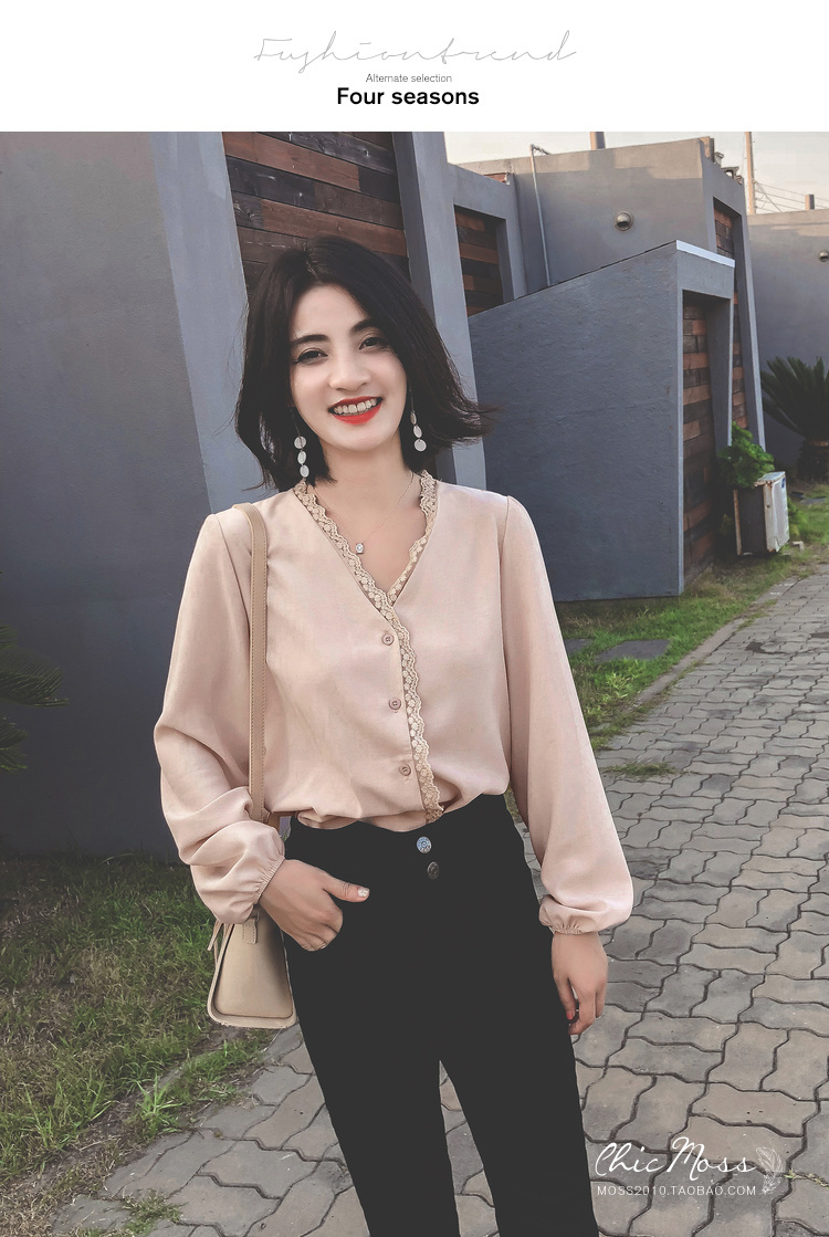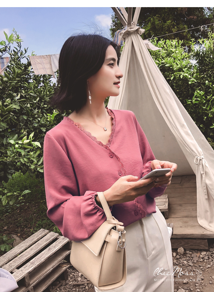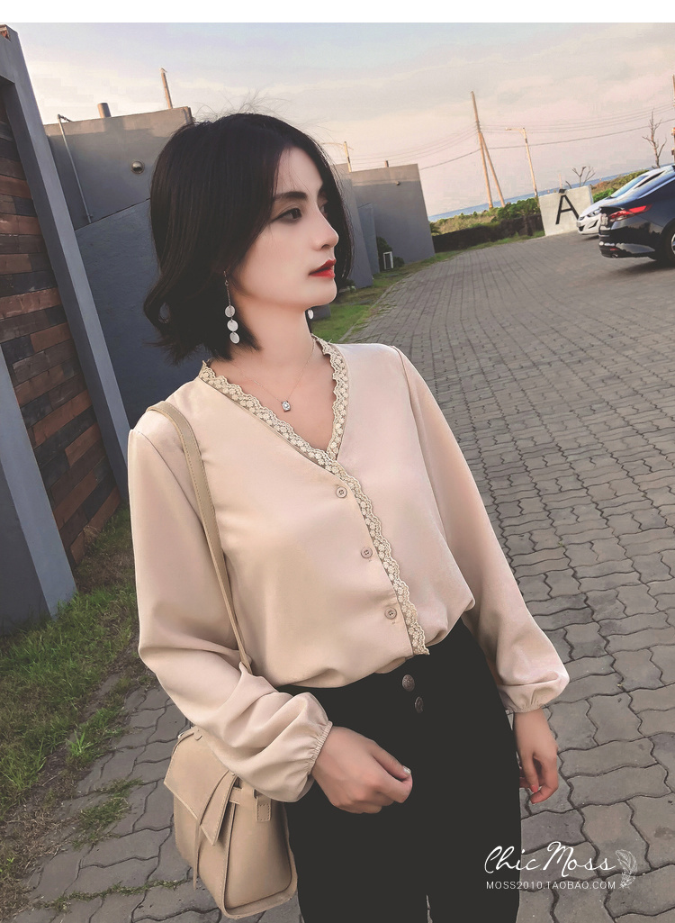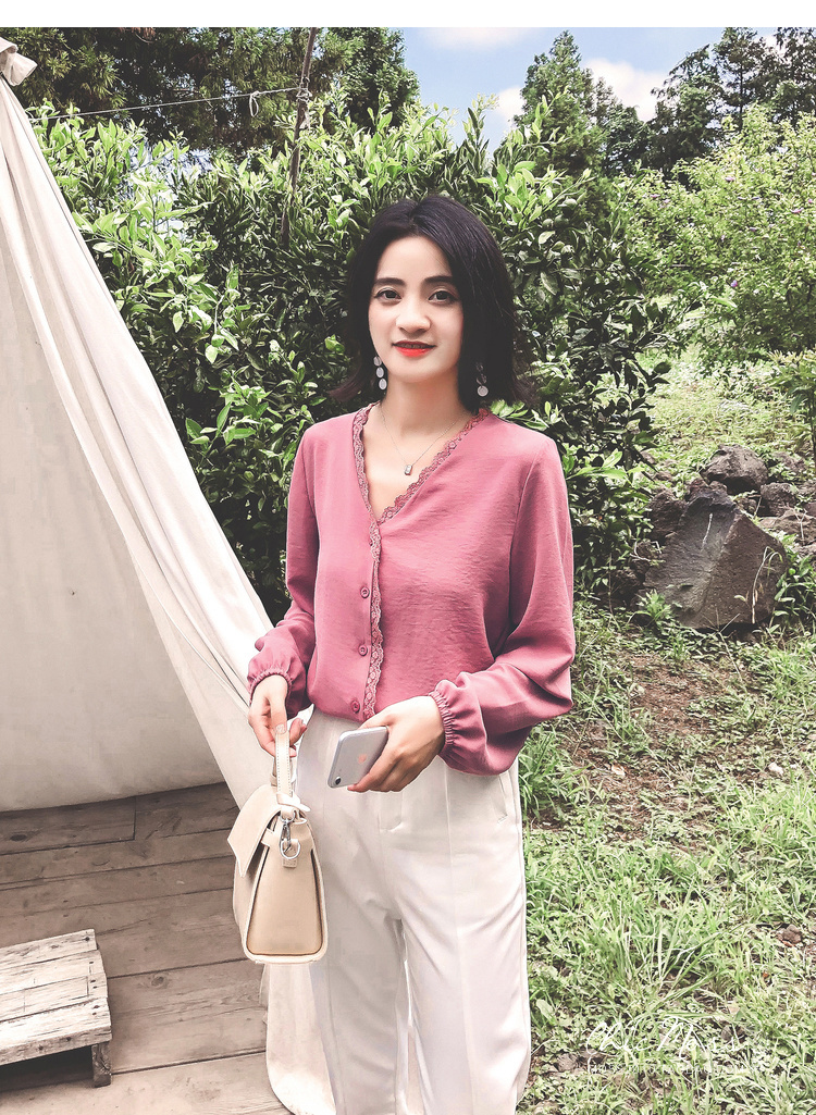 程よいつや感と胸元のレースがフェミニンなVネックシャツ☆