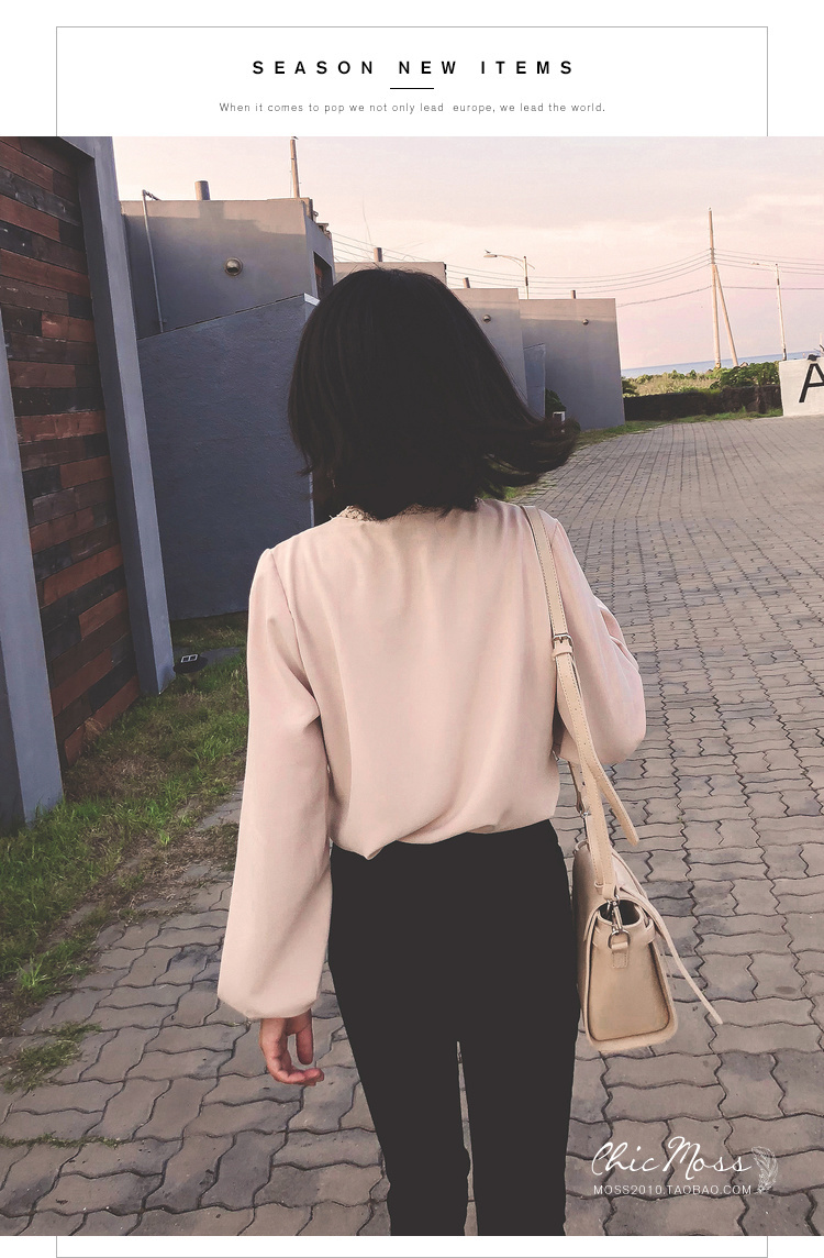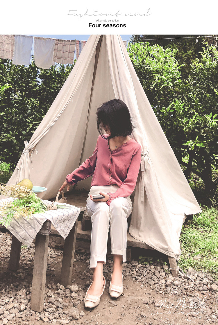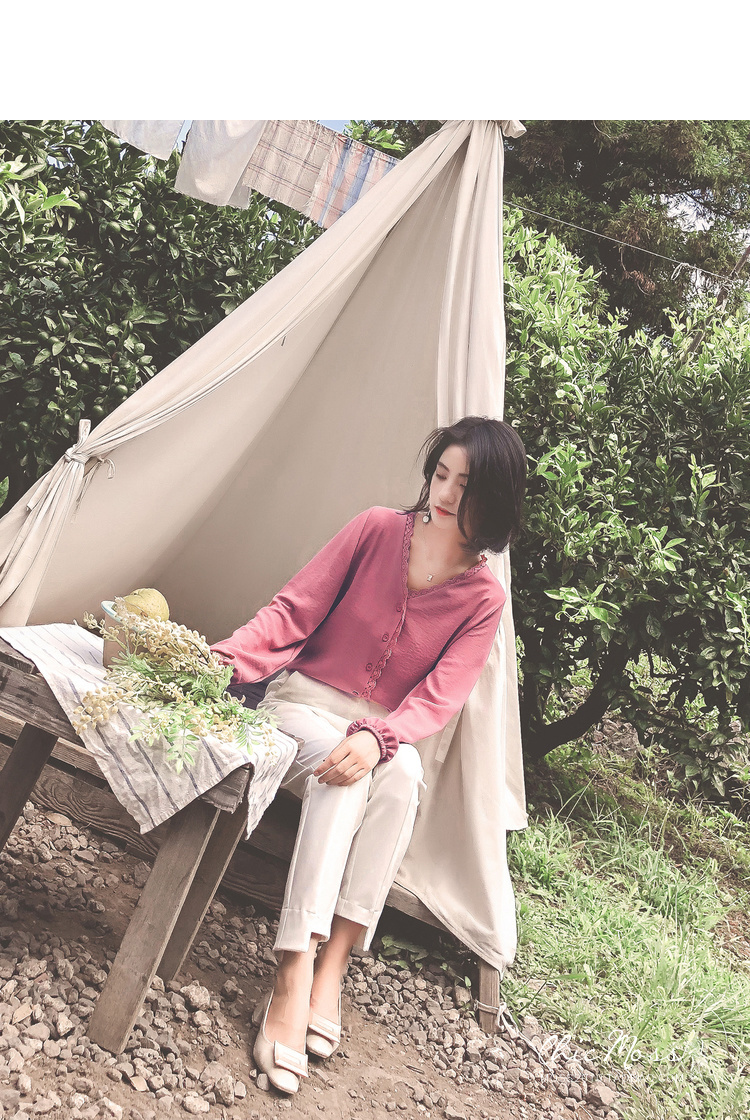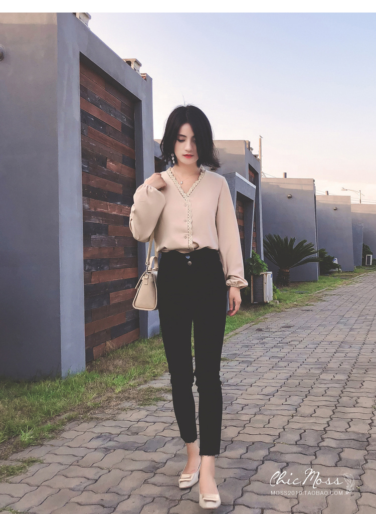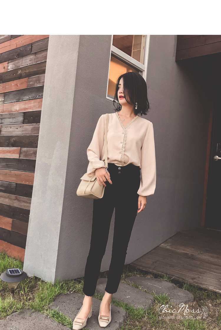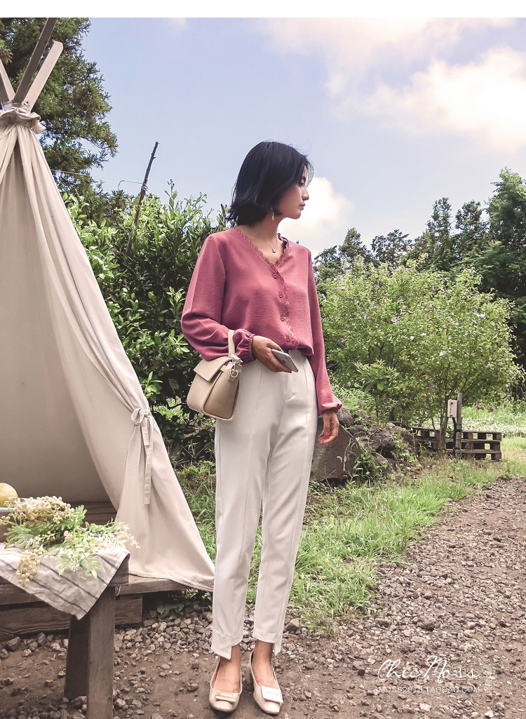 程よいつや感と胸元のレースがフェミニンなVネックシャツ☆