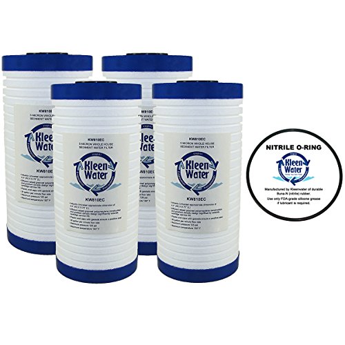 -. Feature : KleenWater brand dirt sediment water filter with raised groove polypropylene construction / 4.5" (L) x 9.75" (W) Dirt, rust and sediment filtration; Made with NSF approved materials / Tri-gradient design provides superior filtration - 5 micron entrapment rating / Plastic end caps with gaskets ensure positive seal - 20 GPM / Oring is compatible with Whirlpool WHKF-DWHBB