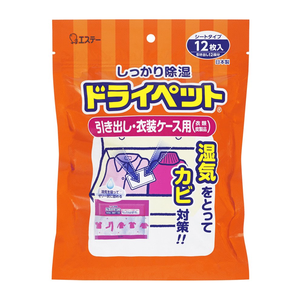 「ドライペット 衣類・皮製品用 お徳用 25g×12シート入」は、除湿・防カビ・消臭の3つの効果を発揮するシートタイプの除湿剤です。吸った湿気をゼリー状に固めます。吸湿効果、お取替え時期がひと目でわかる親切設計です。使いやすい引き出し・衣装ケース用。お徳用の12シート入り。