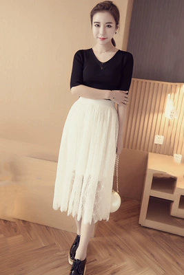 春装新款韩版百搭高腰中长款半身裙镂空透视蕾丝裙休闲裙子女