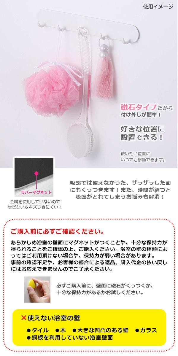 | 磁石でくっつける5連タイプのバスフック。ボディブラシや泡立てネットなどの小物の保管に便利です。付け外しが何度でもでき、位置調整も簡単にできます。 |