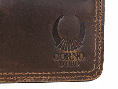 Unisex Organizer / Reisebrieftasche im Vintage-Look aus naturgegerbtem hochwertigem Buffelleder in bester Qualitat - ein robustes Leder welches pflanzlich gegerbt wurde. Der Vintage Look des Geldbeutels sorgt fur einen stilvollen Auftritt und passt perfekt zu anderen Corno d´Oro und Trifoglio-Produkten.