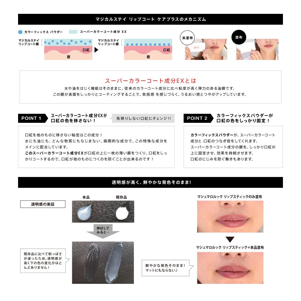 With the action of Super Color Coat Component EX and Color Fix Powder, the color of lipstick does not stick to cups, etc., vivid color lasts for a long time.