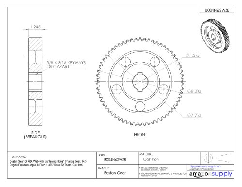 Boston Gear GH62A Web with Lightening Holes Change Gear, 14.5 Degree Pressure Angle, 8 Pitch, 1.375" Bore, 62 Teeth, Cast Iron