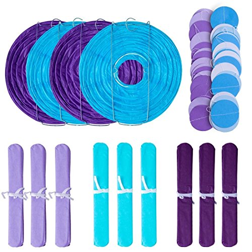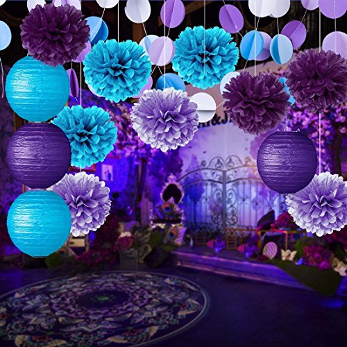 - PACKAGE INCLUDES-15pcs Purple and Blue party decoration package include 9 pcs tissue paper flowers,4 pcs Lanterns Papers and 2 pack 6.5 feet circle dot paper garland.This party decoration set is perfect to spice up, decorate, and impress at any event