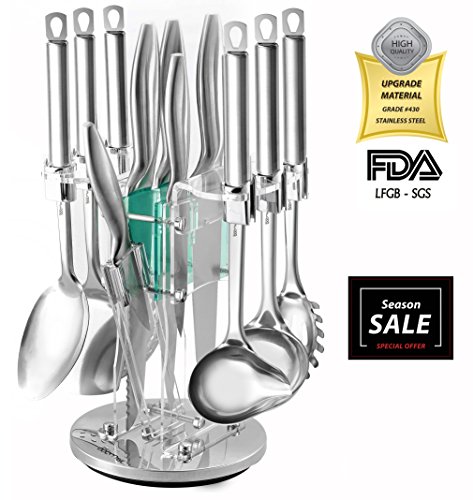 - ALL WHAT YOU NEED! Our 13 piece set includesSpatula, Serving Spoon, Spaghetti Server, Soup Ladle, Dessert Ladle, Skimmer, 8" chef, 8" bread, 8" carving, 5" utility, & 3½" paring knives for food prep and serving. Plus 6 - 4½" steak knives, and 8" kitchen scissors, 8" sharpener and an acrylic block stand. It is a beautiful kitchen collection. A favorite baking and cookware utensil for every chef.