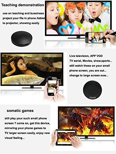 -. Feature : 1. Wireless interconnection, up to 10 meters wireless transmission range, extremely stable and reliable. Mini, lightweight, convenient for travel / 2. Users also could mirror online contents on Chrome to HDTV, when playing 3D MSG (Motion Sensing Game), you could use the tablet as the game control, and enjoy it with the big TV screen / 3. Supported Protocals - DLNA: support Android multi-screen interactive; Airplay: support iOS multi-screen interactive; Miracast: Support Android, iOS, Macbook & Windows8.1 with screen mirroring / 4. Support Airmirror/ DLNA/ Airplay/ Miracast to sync cast photo/ video/ music/ office file/ web browser/ live camera from iPhone/ Android Smartphone/ tablet PC to large screen TV/ Projector by WiFi, perfect for PPT presentation and video meeting / 5. For Android 0S: Support Android OS 4.2 or above(Phone Operating System: Android phone). For IOS: Support IOS 7.0 to I0S 10 (Devices: For all iPhone model after iPhone4 / all iPad model after iPad 2 / all iPod touch after iPod touch 4th generation)