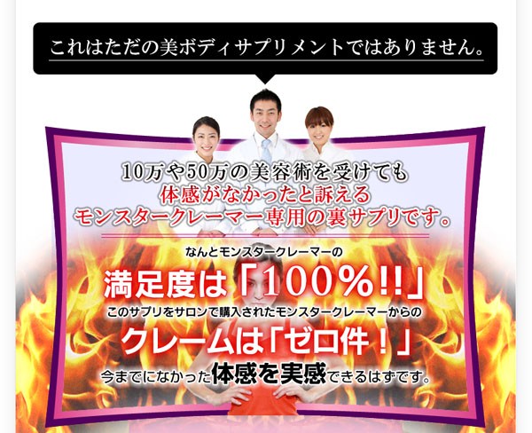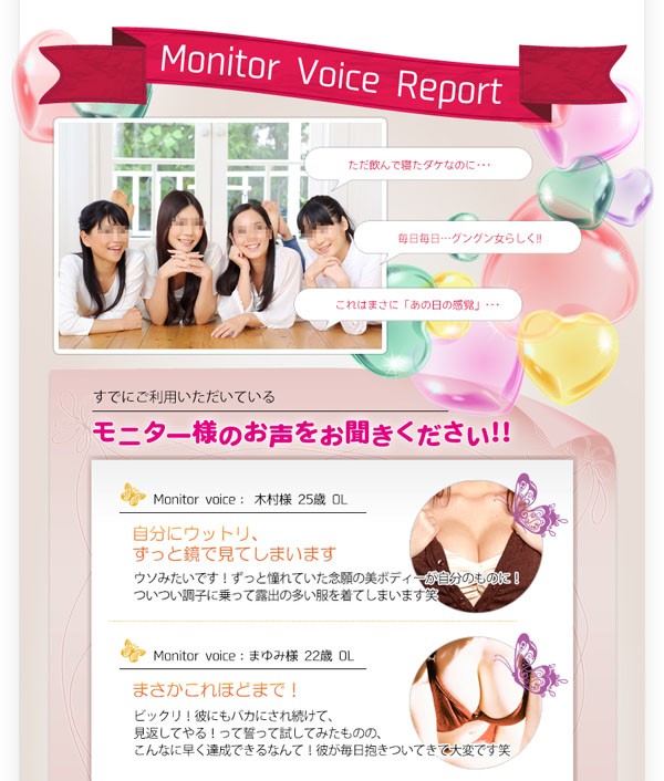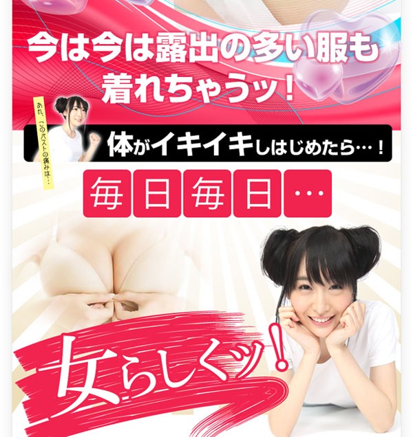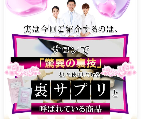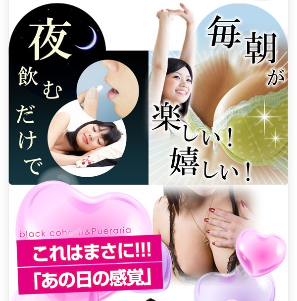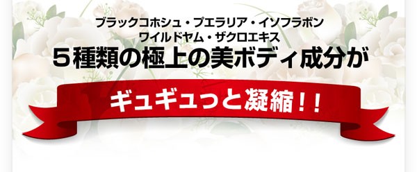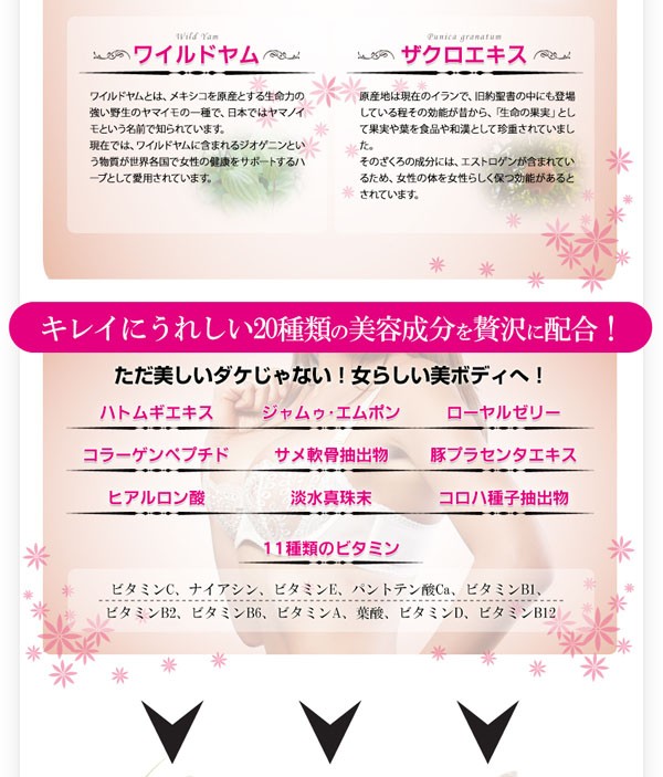 プエラリアミリフィカ末、ブラックコホシュエキス末、大豆抽出物、ハトムギエキス末、ジャムゥ・エムポン(ざくろ、くすの木、ウコン、バジル、しょうが、やまいも)、ローヤルゼリー末、ワイルドヤム抽出物、フィッシュコラーゲンペプチド、サメ軟骨抽出物、豚プラセンタエキス末、ザクロエキス末、コロハ種子抽出物、淡水真珠末、結晶セルロース、ショ糖脂肪酸エステル、ヒアルロン酸、ビタミンC、ナイアシン、ビタミンE、パントテン酸Ca、ビタミンB1、ビタミンB2、ビタミンB6、ビタミンA、葉酸、ビタミンD、ビタミンB12(原料の一部に大豆、やまいも、ゼラチン、豚肉を含む) |
