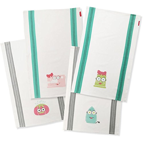 - Each towel features a different character: smiling sewing machine, iron, thimble and pin cushion