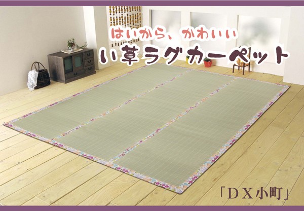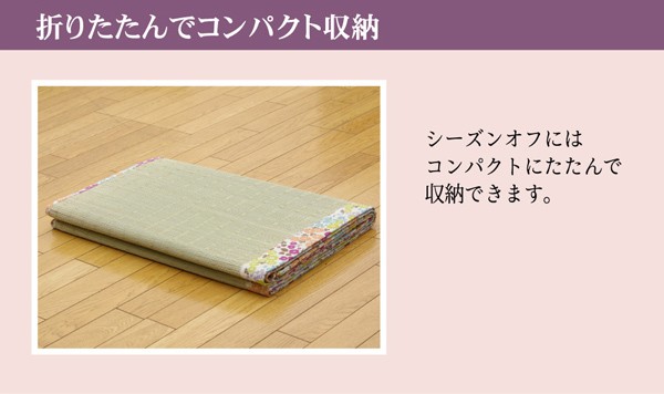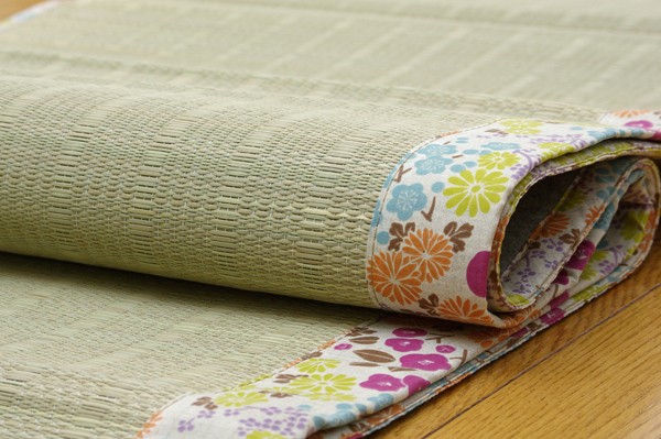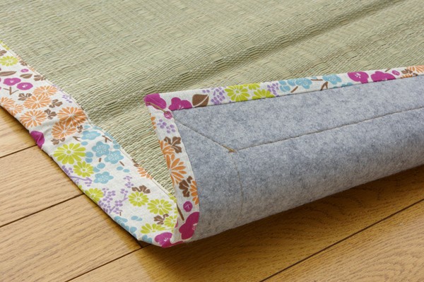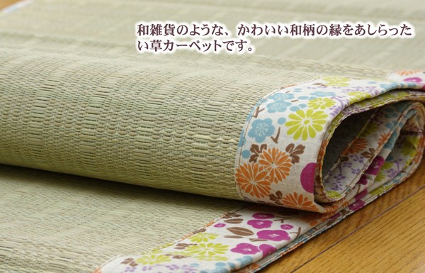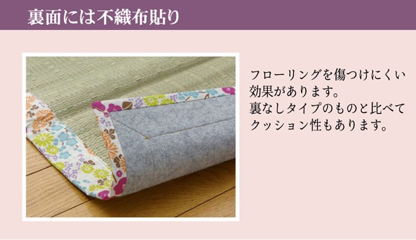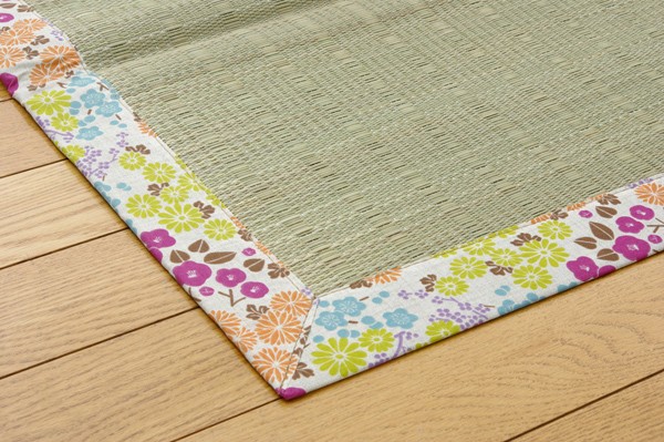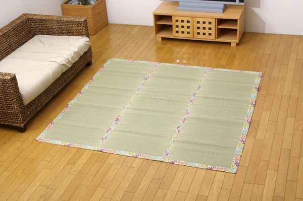 ヘリに花柄をあしらったい草ラグです。い草には空気の自然浄化作用、湿度の調節作用などがあります。また汚れにくく、使用するうちに黄金色に変化し味が出ます。い草に青森ヒバ加工を施しています。(抗菌、防臭効果)フローリングを傷つけにくいよう、裏には不織布を貼っています。