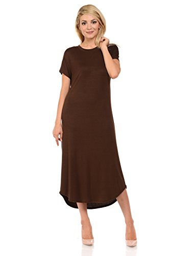 This dress features banded crew neckline, short sleeves, round hem and pull over style. It is made with a soft jersey knit for better drape and stretch. Accessories not included.