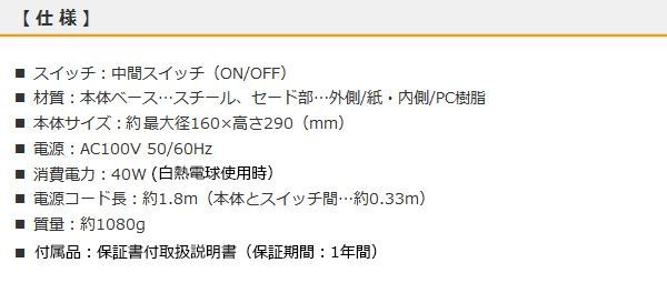 fk094igrjs紙セードから光がやわらかく広がります サイズ 個装サイズ:18×31×18cm 重量 個装重量:1380g 製造国 中国 和風デザインの趣があるスタンドライト ※電球は別売です(使用電球/全長120mm・最大径60mm以下、口金:E26) 以下の指定以外の電球、特殊電球は使用しないでください 発火、発煙、火災の原因となります 【白熱電球】 40W以下を使用してください 【電球形蛍光灯】 10W以下を使用してください 【LED電球】 8W以下、質量110g以下を使用してください ※LED電球を使用する場合、広配光のタイプをお勧めします 紙セードから光がやわらかく広がります ご注文後3~4営業日後の出荷となります