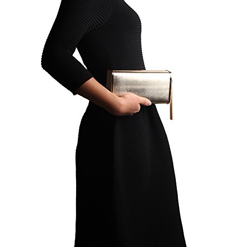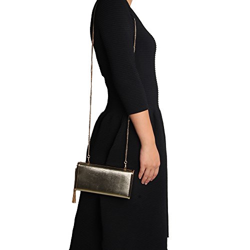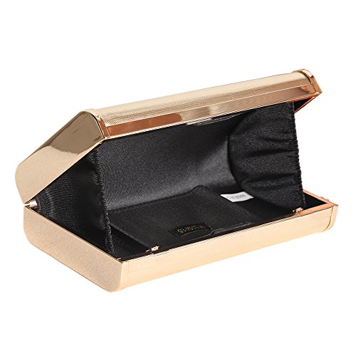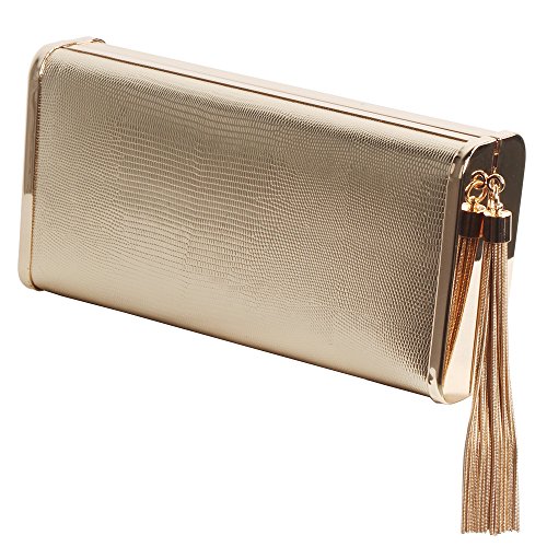 -. Feature : **Imported / **Dimension:19" x 3.80" x 1.80"(Lx H x W) / **Gold Metallic PU, stylish metal tassel in nice light gold, high quality metal frame, invisible magnetic button closure, it's gracefull, elegant , noble and generous for you to carry it for wedding party, family reunion, prom, Masque, banquet and cocktail party / **It's metallic stylish party bag which have enough space to carry cell phone, car keys, mirror, and some cosmetics, and the interior of bag is with slip pocket to hold accessories and value items, you can hold this bag in hand as clutch, or cross over the shoulder using the straps chain / **Strap chain is long in 120cm, strap middle drop is 24", and the strap chain can be removable
