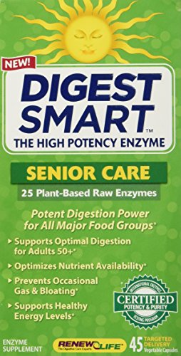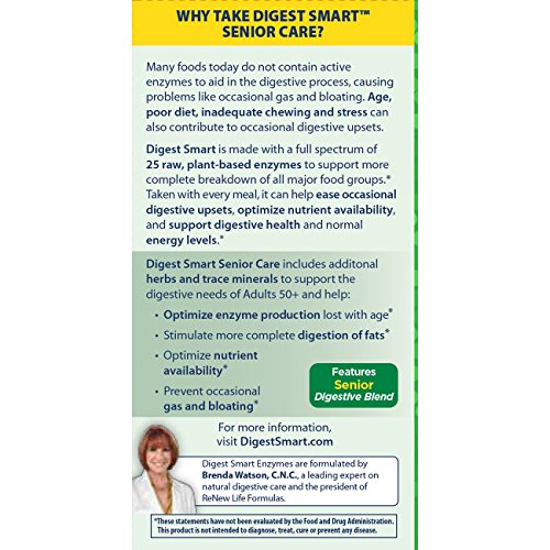 Digest Smart Adult 50+ Care is a broad-spectrum digestive enzyme formulated with 25 plant-based, raw enzymes to help break down protein, carbohydrates, fats, and fiber. This formula may help prevent occasional gas, bloating, and indigestion, and includes additional herbs and trace minerals that may help optimize enzyme production lost with age. Digest Smart high-potency formulas are made with maximum Enzyme Activity Values so you can comfortably enjoy more of your favorite foods. These statements have not been evaluated by the Food and Drug Administration. This product is not intended to diagnose, treat, cure, or prevent any disease. * These statements have not been evaluated by the Food and Drug Administration. This product is not intended to diagnose, treat, cure, or prevent any disease.Feature