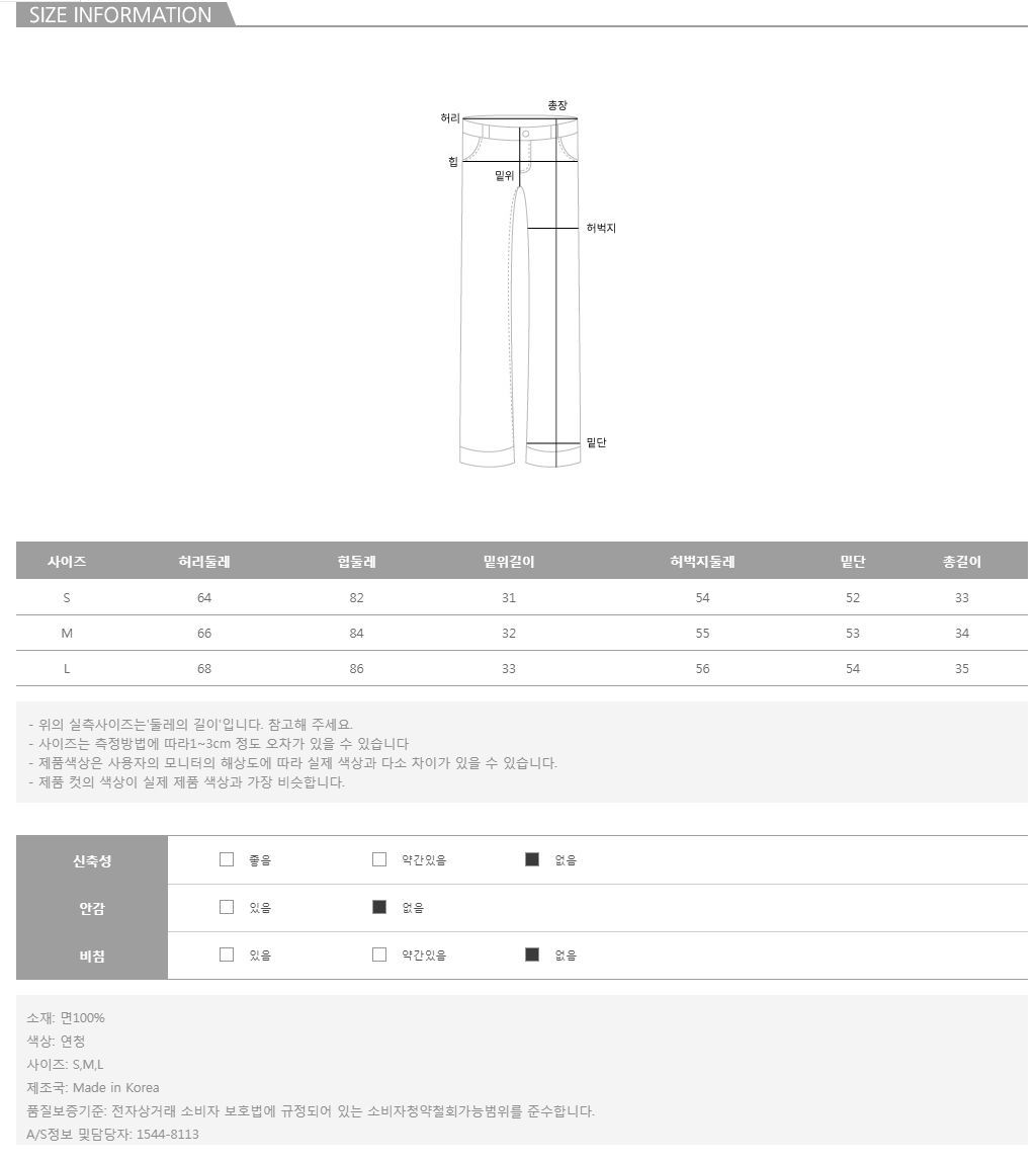 S - 허리둘레 64 / 힙둘레 82 / 밑위 31 / 허벅지둘레 54 / 밑단둘레 52 / 총길이 33