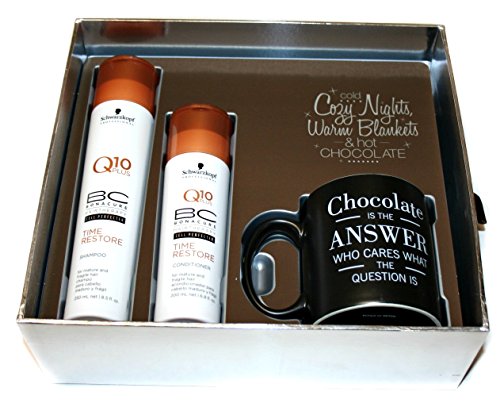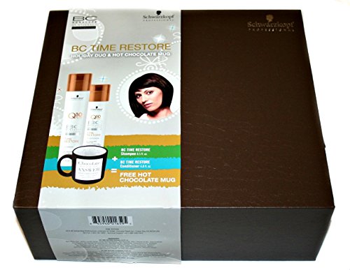 -. Feature : BC Time Restore Shampoo (8.5 fl oz) - an anti-aging gentle cleansing shampoo for dry, brittle and mature hair. / BC Time Restore Conditioner (6.8 fl oz) - protects against external agressors, provides strength and resistance, detangles, adds shine. / Hot Chocolate Mug / Gift box