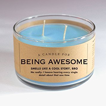 Candle for Being Awesome 17 oz Candle One surfing lesson scented (Ocean) by Whiskey River Soap Co. One surfing lesson scented (Ocean) ~ Burn time: 60 hours ~ Net Weight: Approximately 17 oz. Cool story, bro. You know how some people try really hard to be awesome and other people are just naturally that way? It's like the difference between some suuuper lame story about like, college credits or your thesis, and a totally awesome story about jumping really high or explosions. Yeah, you know what I'm talking about. Bro. Whiskey River Soap Co. make soap and candles that smell great and hopefully make you laugh. They are all about hand-making their own products because they are not just selling you a funny label wrapped around something mass-produced in China. They believe both quality and humor to exist together, and hope you agree.Feature