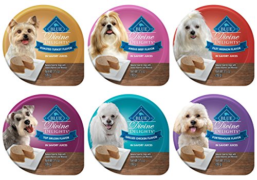 Includes Blue Buffalo Divine Delights Small Breed Adult Dog Food Pates in 6 Flavors - Top Sirloin, Filet Mignon, Porterhouse, Angus Beef, Grilled Chicken & Roasted Turkey (12 Cups Total, 3.5 Oz Each)