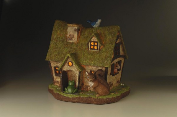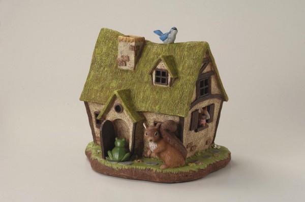 森のおうちをモチーフにしたオーナメントです。 製造国:中国 素材・材質:本体:レジンライト部:ABS樹脂 商品サイズ:W30.5×L26.5×H29cm 重量:3000g 仕様:ソーラーライト2灯付きLED:イエロー ※サプライヤー直送品 ご注文後3~4営業日後の出荷となります【商品名】ソーラーオーナメント 森のおうち SR-0311
