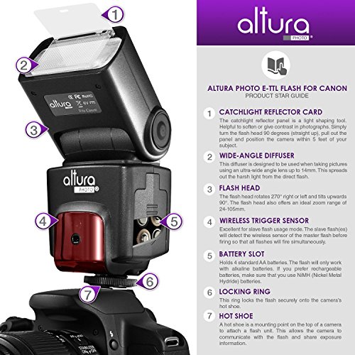 - Feature : Altura Photo® Professional Speedlite Flash (AP-C1001) is a powerful dedicated flash with a high guide No. 68(m) / 223(ft). / Kit includes: 1 Altura Photo E-TTL Auto-Focus Dedicated Flash + Wireless Camera Flash Trigger and Camera Remote Control Function 1 Transmitter, 1 Receiver (Wireless Camera Flash Trigger does not transmit Flash TTL settings.) + Cable-C Cord for Remote Control + Protective Pouch (Batteries Not Included) + Hard Flash Diffuser + MagicFiber Microfiber Lens Cleaning Cloth. / Compatible with CANON EOS 70D, 60D, SL1, Rebel T5i, T4i, T3i, T2i, T1i, T5, T3, XT, XSi, XSi. / 1-Year Limited Warranty. Altura Photo Authorized Dealer. / Backed with Digital Goja 90-Day 100% Satisfaction Guarantee. If you're not happy with your flash for any reason, please contact us and we will take the product back for a full refund.