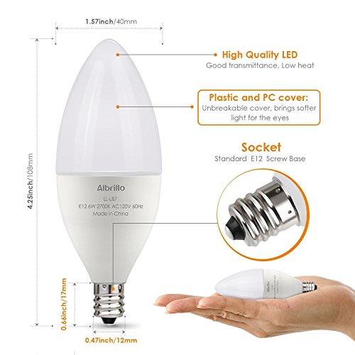 Product Description Albrillo E12 Bulb, LED Candelabra Light Bulbs 60 Watt Equivalent, Soft White 3000K LED Chandelier Bulbs, Decorate Candle Base E12 Non-Dimmable, 4 Pack 0