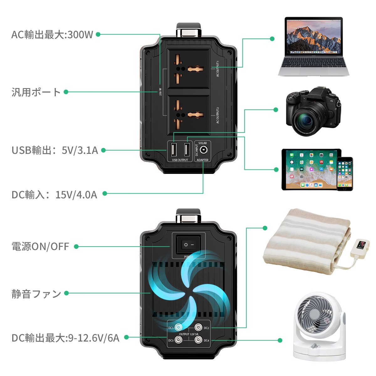 AC: 110 V / 60 Hz (Max 300 W, pure sine wave) USB: 5 V / 3.1 A (Max) x 2