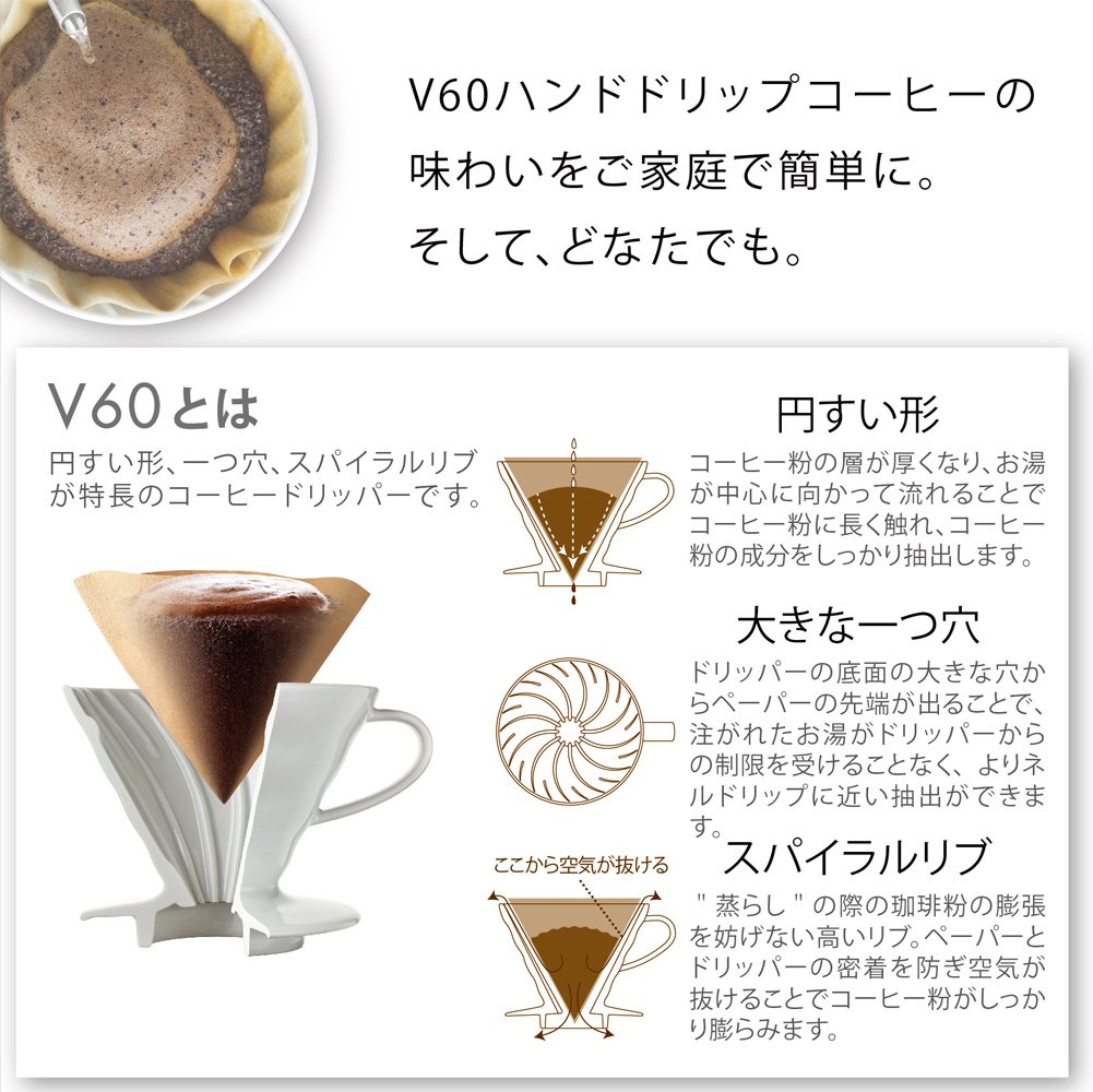 ● V60 conical type dripper thickens the layer of coffee, hot water flows toward the center, hot water touches the coffee powder long, you can extract the ingredients firmly.