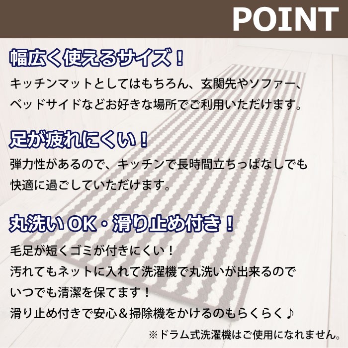 送料650円 【メーカー取寄せ品】 ※北海道・沖縄・離島は送料が別途かかります。 弊社からお送りするメールにて必ずご確認下さい。 飽きの来ない色見と定番ボーダーが可愛いキッチンマット キッチン空間をお洒落で楽しくコーディネートできちゃう! 丸洗いOK!滑り止め加工付きで安心♪ 【材質】ポリプロピレン100% 【サイズ】約45×120cm