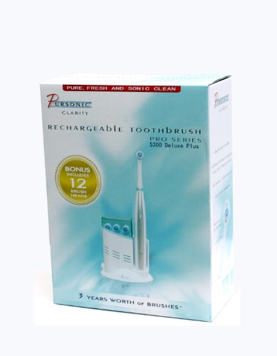 Studio : Pursonic Publisher : Pursonic Binding : Health and Beauty Product Description Pursonic S300 Deluxe Plus Rechargeable Rotary Toothbrush includes 12 brush heads It effectively removes plaque without irritating gums and reaches deep between teeth to remove plaque from hard-to-reach places. It removes even tough stains leaving naturally whiter teeth. It's gentle on teeth and gums The 3400 cycle per minute rotary speed oscillates 60 degrees. Run time is approximatly 25 minutes after fully charged The chargeing unit has a storage cabinet for 3 brush heads . 0