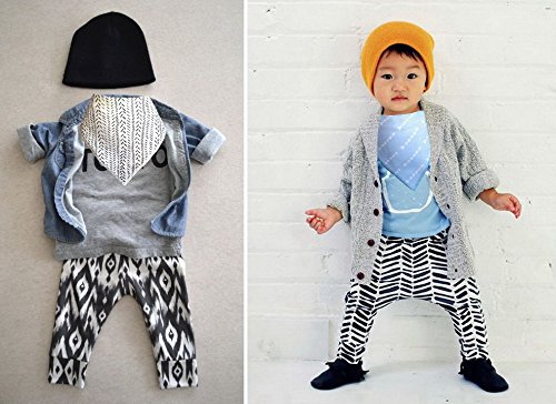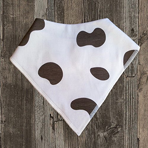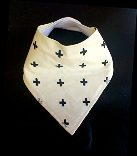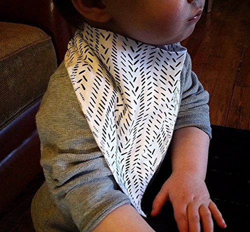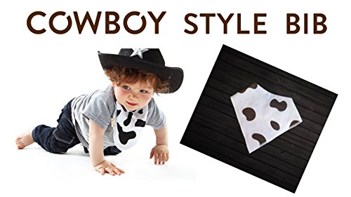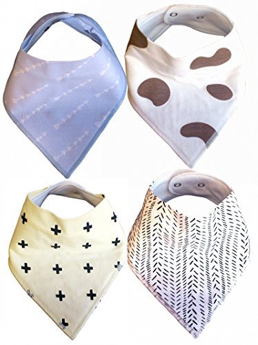 - Feature : DURABLE BABY BANDANA BIBS Gift Set - Top layer made of 100% organic cotton knit and absorbent coating layer is a micro fleece lining material (to prevent moisture from getting to the baby's chest). BABY BIBS AMAZINGLY SOFT and COMFY - A Baby Bandana Drool Bib Set of 4 stylish bibs for girls and boys created by European designer. WASHABLE in washing machine, the bandanas don't shrink up nor fade even in hot washes. Stains are easy to remove. / ABSORBENT DROOL BIBS - Soak up dribble much better than old bibs. The double layer provides a thick padded bib for maximum softness and absorbency. Your babies' cloths will be kept dry from excessive drooling when teething. Effective too when feeding baby. Spits will not be a hassle anymore with MyBabyMyKing fashionable burp cloths. / ADJUSTABLE NECK WITH NICKEL-FREE SNAPS - Suitable for children aged 0-3 years. Start using the bibs when baby is 1 months old and as he grows you can adjust the neck with the 2 snaps. Use the bib up to 3 years! Snaps are strong enough to stay in place when baby tries to pull them off. No Velcro will cause any irritation to the baby delicate skin. HIGH QUALITY STITCHING. / EXTRA CLOTH UP IN FRONT up to the chin: catches most of the spills up before they sink into baby's and mother's clothes. Simply put the bottom corner of the bib over the mother's shoulder while baby is still wearing it, then make baby burp. The edges are sewn securely to have a clean and tidy finish. / COLORS ARE: 1)Cow bib, in white and brown. 2)Crosses bib, in Ivory and Black, 3) Arrows bib in Light Blue and White 4) Hand Art Design bib in Black and White - BANDANA TEETHING SET of 4 ADORABLE, cute, and trendy designs with pretty colors to combine with a variety of outfits, looking attractive, not as old fashioned bibs. They give PLENTY OF COVERAGE for babie's cloths.