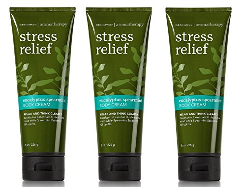 Studio : Bath Body Works Publisher : Bath Body Works Binding : Misc. Product Description Lot of 3 Bath Body Works Eucalyptus Spearmint Stress Relief Body Cream 8 fl oz each- The perfect way to relax and think clearly after a long days work. Made with Eucalyptus and spearmint essential oils to relax and uplift you. Absorbs quickly and provides hours of moisturization. 0
