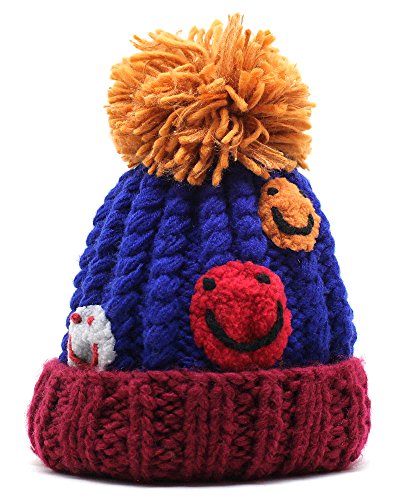 -. Feature : 全国送料無料!スマイルマークのワッペン付☆超可愛いキッズ手編み帽 / 太い毛糸と細目の毛糸を甘撚りにし、ザックリとリブ編みし、大きいボンボンを付けました。 / ニコちゃんマークをフリースに刺繍したワッペンを、カラフルに3個☆付けました!文句なし暖かカワイイ~♪ / 頭囲サイズ:46cm~52cmくらいまで    素材:アクリル / 平置きサイズ:横20cm / 高さ(ボンボン含)29cm