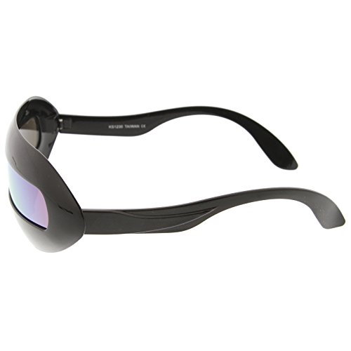 Create an out of this world look with these futuristic inspired sunglasses. Designed with a large wrap around style frame and a single colored mirror shield lens, these bold sunglasses are sure to catch anyone's attention. Complete with a glossy finish and unique curved temples, these shield sunglasses are a great addition to our novelty collection. Perfect for parties or futuristic costumes. Made with a plastic based frame, metal hinges and polycarbonate UV400 protected shield lens. Lens Height: 22 mm | Lens Width: 70 mm | Bridge: 20 mm | Frame Total: 163 mmFeature