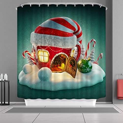VANCAR Waterproof Bathroom Decor Custom Xmas Merry Christmas Shower Curtain Sets with Hooks 66"X72" Funny Christmas Eve House Hat Candy Cane Pattern Print