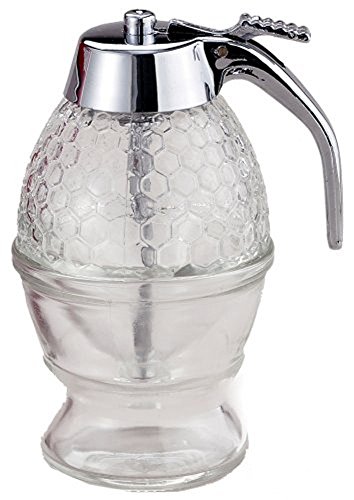 • Honeycomb design glass and honey dispenser has a unique center spout with trigger release. Pours cleanly and stays neat. Includes stand for convenient storage and can be filled with warm water to keep syrup and honey soft and warm.
