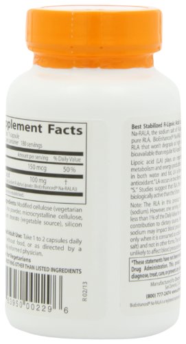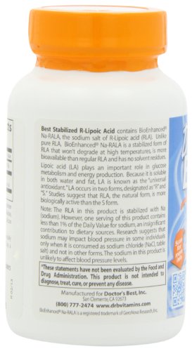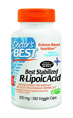 -. Binding : Health and Beauty -. Brand : Doctor's Best -. EAN : 0753950002296 -. Feature : Alpha-lipoic acid is a naturally occurring vitamin-like nutrient that has been intensely investigated as a beneficial agent for a variety of bodily functions involving the nervous, cardiovascular, immune, and detoxification system. / It is produced in small amounts in the liver and other body tissues, where it is needed by enzymes to catalyze numerous essential chemical reactions in the body. / ALA is essential inside the mitochondria of cells, where it is needed to metabolize glucose and direct calories into energy production / ALA is considered to be a multimodal supplement because, aside from its enzymatic role in energy production, it acts by multiple mechanisms and displays diverse health-enhancing and antioxidant properties / Vegetarian / Label images may vary -. IsAdultProduct : 0 -. IsAutographed : 0 -. IsMemorabilia : 0 -. Label : Doctor's Best -. Manufacturer : Doctor's Best -. Model : 753950002296 -. MPN : DRB-00229 -. NumberOfItems : 1 -. PackageQuantity : 1 -. PartNumber : DRB-00229 -. ProductGroup : Health and Beauty -. ProductTypeName : HEALTH_PERSONAL_CARE -. PublicationDate : 2014-12-12 -. Publisher : Doctor's Best -. ReleaseDate : 2014-12-09 -. Size : 180 -. Studio : Doctor's Best -. Title : Doctor's Best Stabilized R-lipoic Acid, 180-Count -. UPC : 753950002296