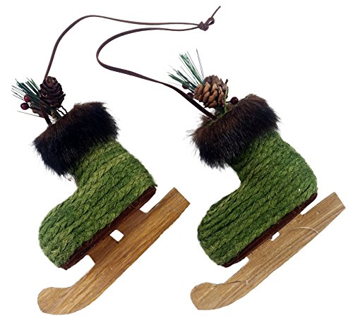 - Features a knitted ice skate boot with a woodsy pine cone accent on top