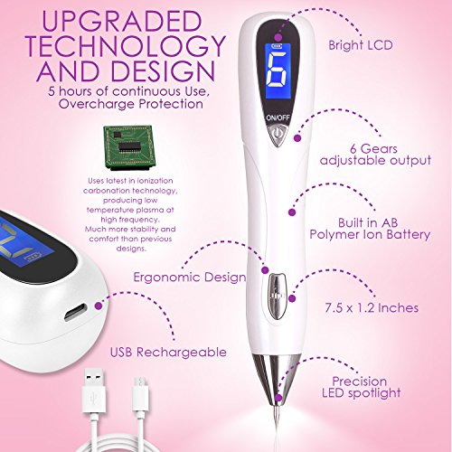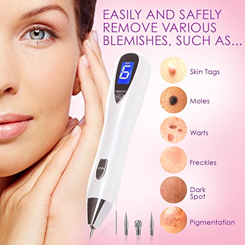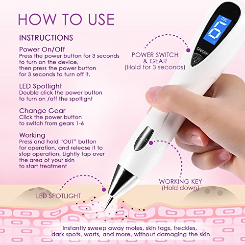 - ⚜ SAVE TIME AND MONEY; PROFESSIONAL RESULTS: Why spend thousands of dollars and hours of your time at a dermatologist when you can achieve the same results from the comfort of your home. Just make sure to follow the simple instructions (included) by holding down the OUT button on the device and lightly tapping over your target area. If it’s your first time using the device, always start with gears 1 or 2. The area you treat will scab over and eventually fall off.