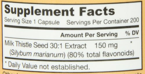 Supplement Facts Serving Size 1 Capsule Servings Per Container 200 Amount Per Serving Milk Thistle Seed 30:1 Extract 150 mg * ( Silybum marianum) (80% total flavonoids) Other Ingredients: Cellulose, magnesium stearate (vegetable source) and silicon dioxide. Capsule consists of gelatin.