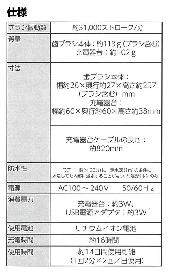 | 素材・材質 | 本体:ABS樹脂、柄:PP樹脂、毛:ナイロン 充電器台:PC樹脂・ABS樹脂 |